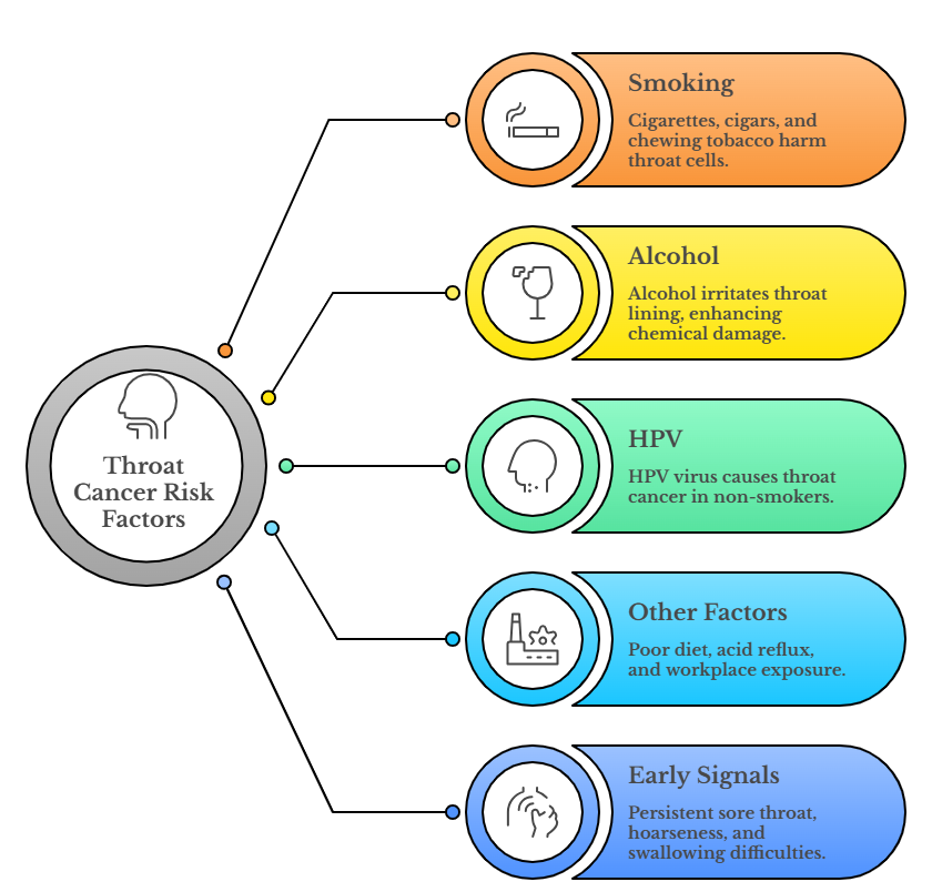 Smoking exposes the throat to harmful chemicals again and again, which can slowly damage healthy cells and raise risk.