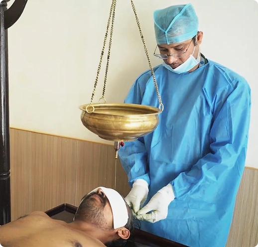 Warm herbal oil is slowly poured and held on the scalp, which penetrates through the scalp and nerves, calming the mind and balancing doshas. This process helps reduce overthinking and mental restlessness.