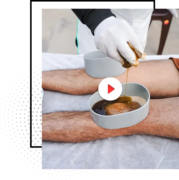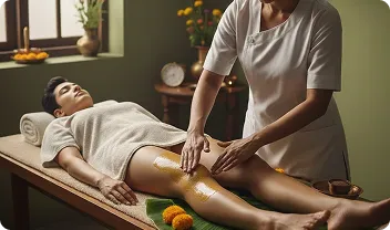 The patient is asked to lie down comfortably on the treatment table in a calm and clean environment. A gentle massage is given to the knee using medicated oil to relax the muscles and improve blood flow. This is followed by mild steam therapy to open the pores and loosen stiffness.