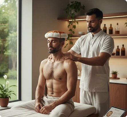 Purva Karma is the preparatory step before the main Shiro Pichu therapy. It readies the head, scalp, and nervous system for deep, effective treatment. The Ayurvedic doctor checks stress levels, mental tension, sleep quality, and overall health. Based on Vata and Pitta involvement and the patient’s condition, the doctor chooses the right medicated oil and decides how long it should stay.